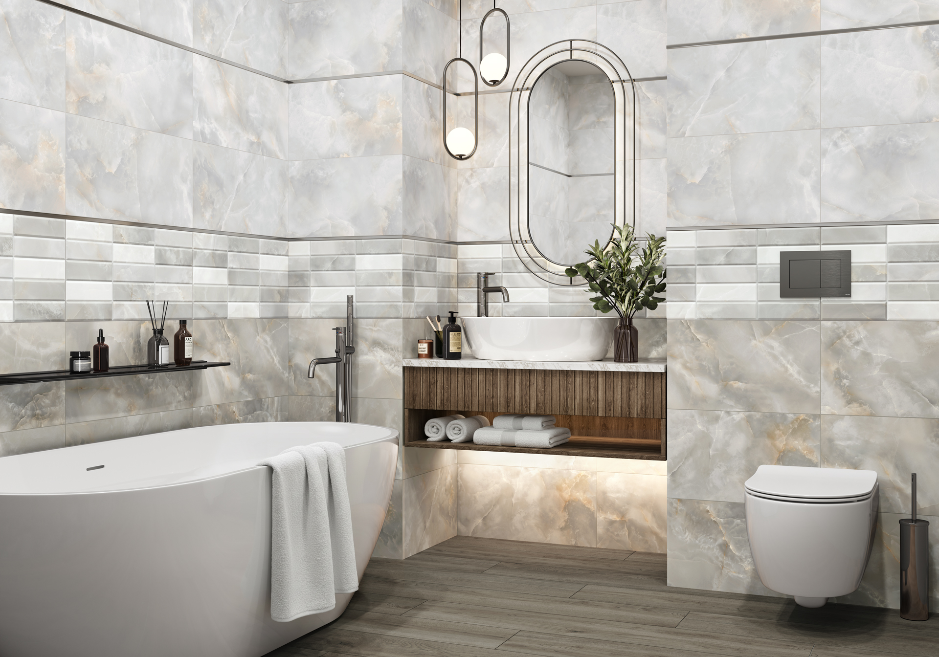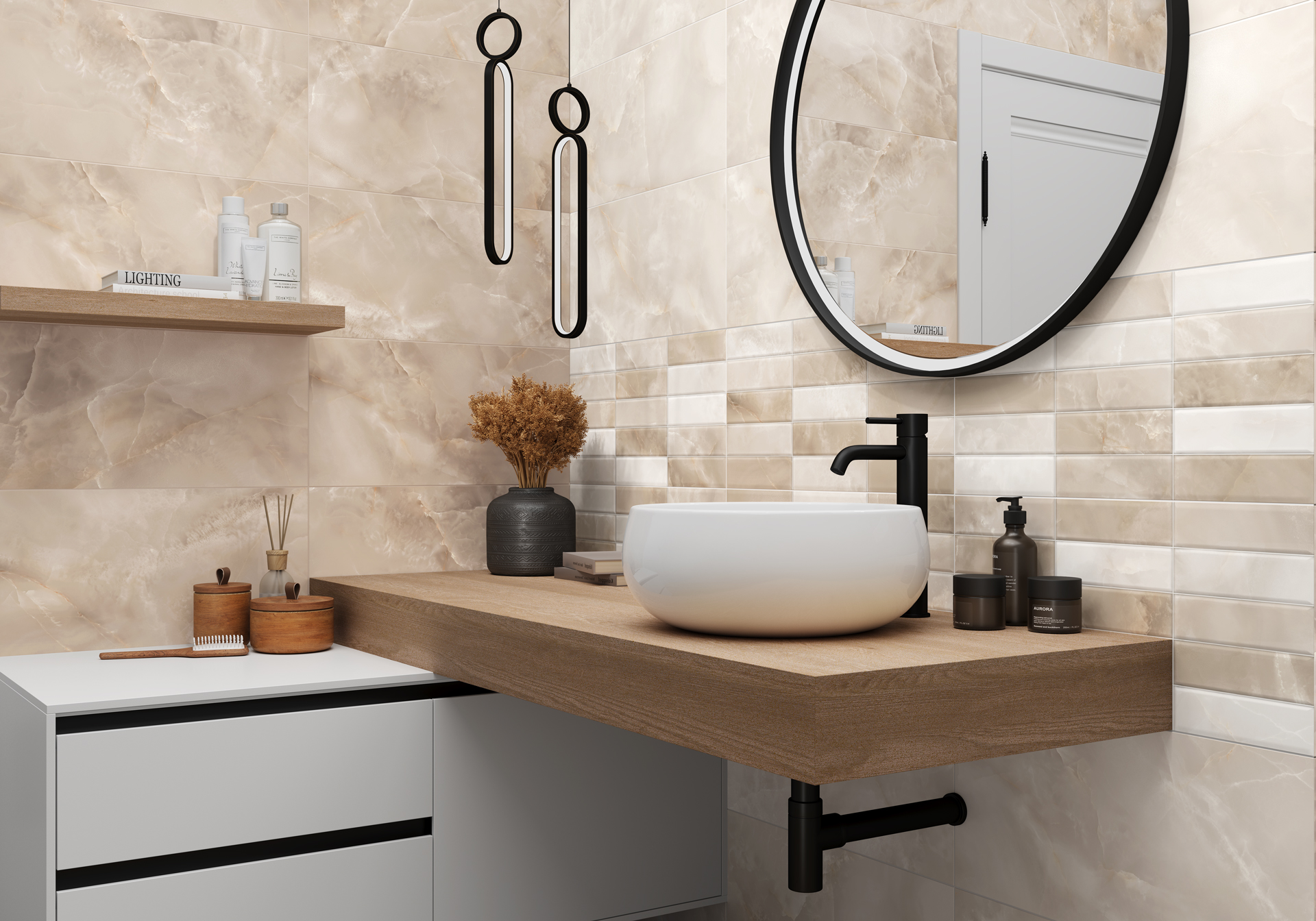 Керамическая плитка коллекции Azimut — простое и стильное решение для создания уютного и современного пространства в ванной комнате. Формат — 300x600 мм с мягкой матовой поверхностью. Палитра в спокойных бежевых и серых оттенках создаст тёплую и расслабляющую атмосферу. Ключевой акцент — декоративный массив с рельефом кирпичей. Каждый кирпичик имеет благородную мраморную текстуру и сочетает несколько оттенков, образуя живописную мозаику. Это добавляет стенам интересный ритм и динамику. Такой декор можно применить не только в ванной комнате, но и на кухне в качестве фартука над столешницей, что позволит стилизовать помещение и будет практичным решением в этой зоне. Напольный керамогранит и декоративный бордюр помогут создать завершённый образ вашего пространства.