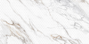 Коллекция представлена в формате 300х600 мм с глянцевой поверхностью и текстурой красивого мрамора арабескато и белого мрамора каррара. Два цвета базовых плиток дополняет декоративный элемент со спецэффектом. Мелкодисперсный мерцающий глиттер нанесен в виде объемных мелких бусин с шахматным ритмом на светлую мраморную базу. При попадании света на декор он отражает свет и переливается, привлекая внимание. Дополняет композицию керамический бордюр 13x600 мм в платиновом цвете и матовый керамогранит в формате 600x600 мм.