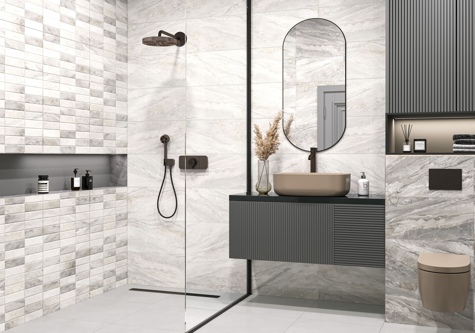 Коллекция Адриатик / Adriatic — это дыхание моря, застывшее в камне. Тёплая гамма создаёт атмосферу солнечного побережья, наполняя пространство светом и уютом. Холодная гамма передаёт свежесть и глубину морской воды, добавляя интерьеру сдержанности и элегантности. Ключевой элемент — декоративные массивы на рельефе «кирпичик». Они сохраняют мраморную текстуру в тон базовых плиток, но за счёт рельефа создают выразительный объём. С помощью этих элементов можно акцентировать стену, создав эффектную фокусную точку, добавив пространству сложности и художественной завершённости.