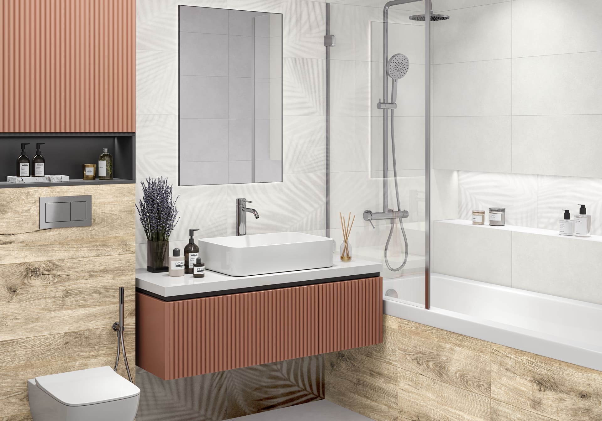 Коллекция керамической плитки Марко / Marco в формате 300x600 мм с матовой поверхностью объединяет урбанистическую эстетику и природные мотивы. В её основе — два базовых оттенка с текстурой бетона, которые создают нейтральный современный фон. Их дополняет плитка с текстурой натуральной древесины, добавляющая пространству стиля. Центральным акцентом служит декоративный массив с графичным орнаментом теней пальмовых листьев, вносящим динамику и индивидуальность в пространство.